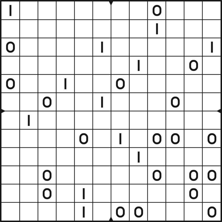 A daily binairo puzzle! Solve each puzzle with only 0's and 1's. Remember: No more than two the same numbers may be placed directly next to or below each other. Every row and every column must contain as many zeroes as ones. The combination of zeroes and ones in every row must be unique, as does the combination in each column.