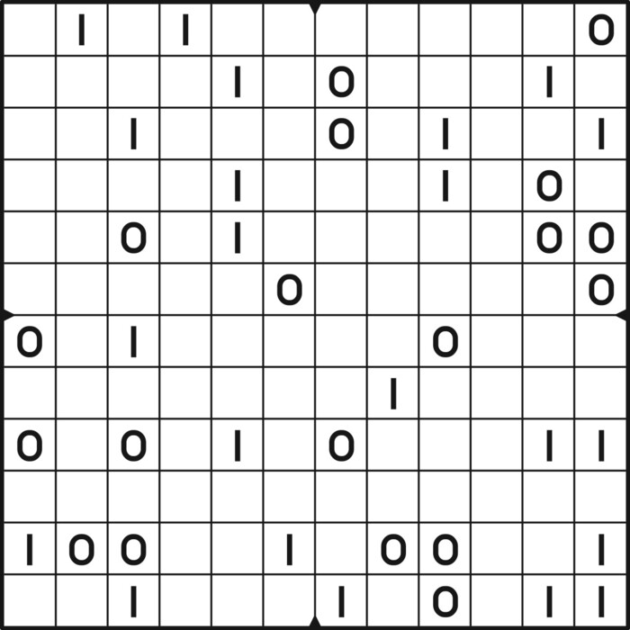 Every Sunday solve a special edition binairo. Remember: Solve each puzzle with only 0's and 1's and no more than two the same numbers may be placed directly next to or below each other. Every row and every column must contain as many zeroes as ones. The combination of zeroes and ones in every row must be unique, as does the combination in each column.