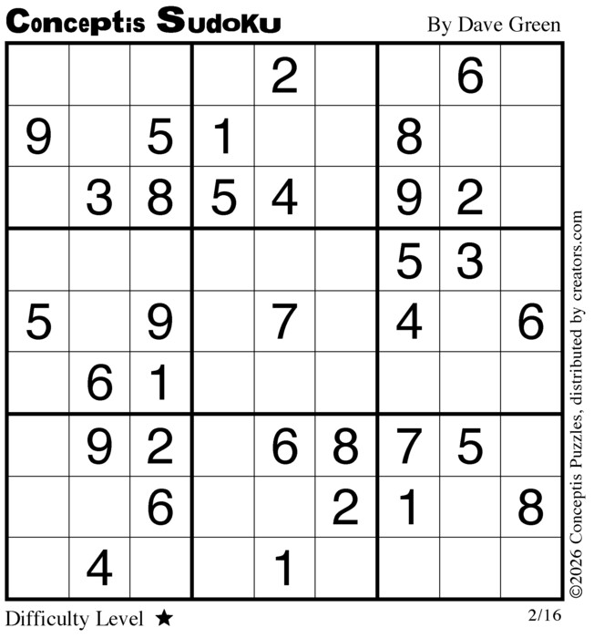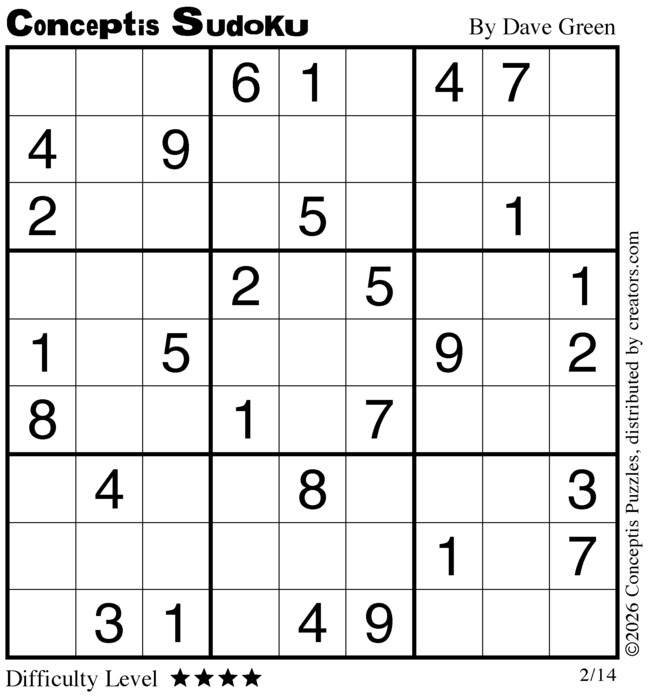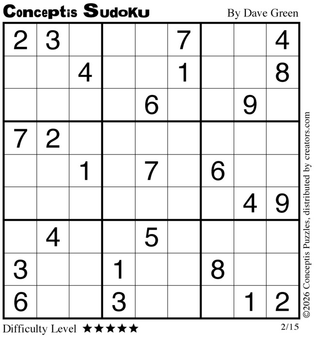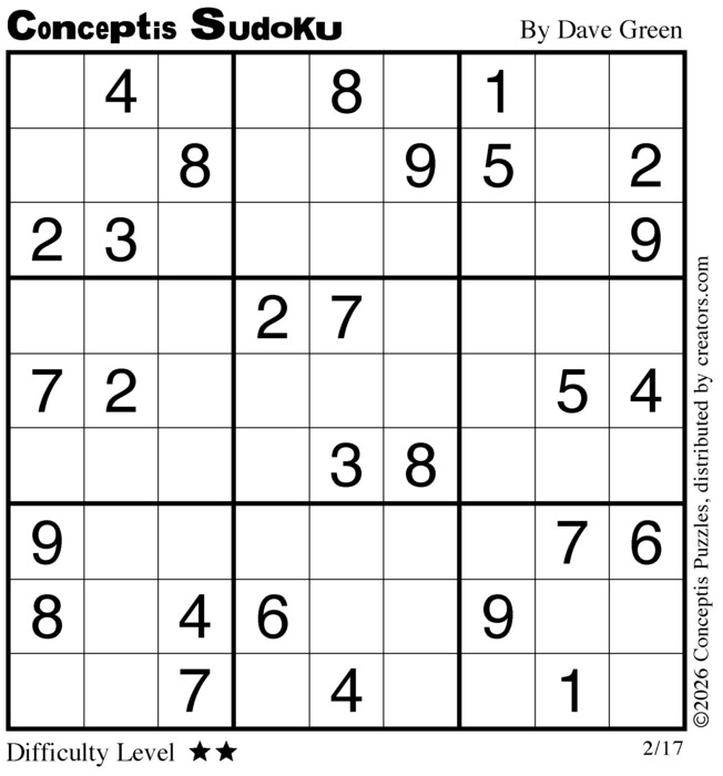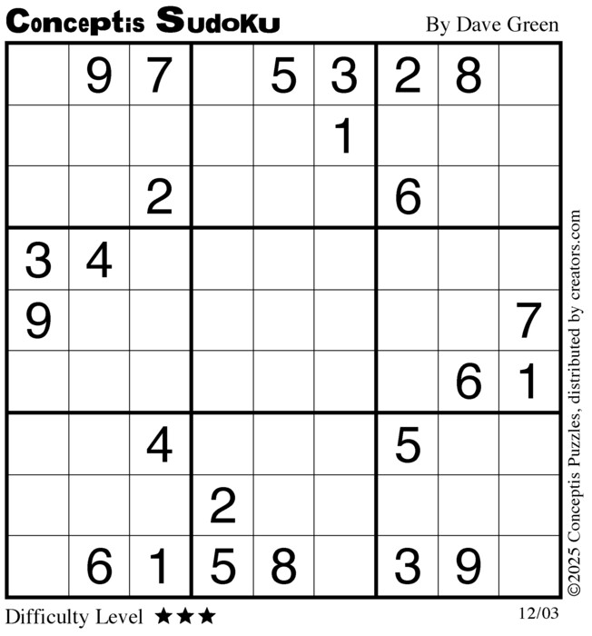 Each puzzle consists of a 9x9 grid containing given clues in various places. The object is to fill all empty squares so that the numbers 1 to 9 appear exactly once in each row, column and 3x3 box.